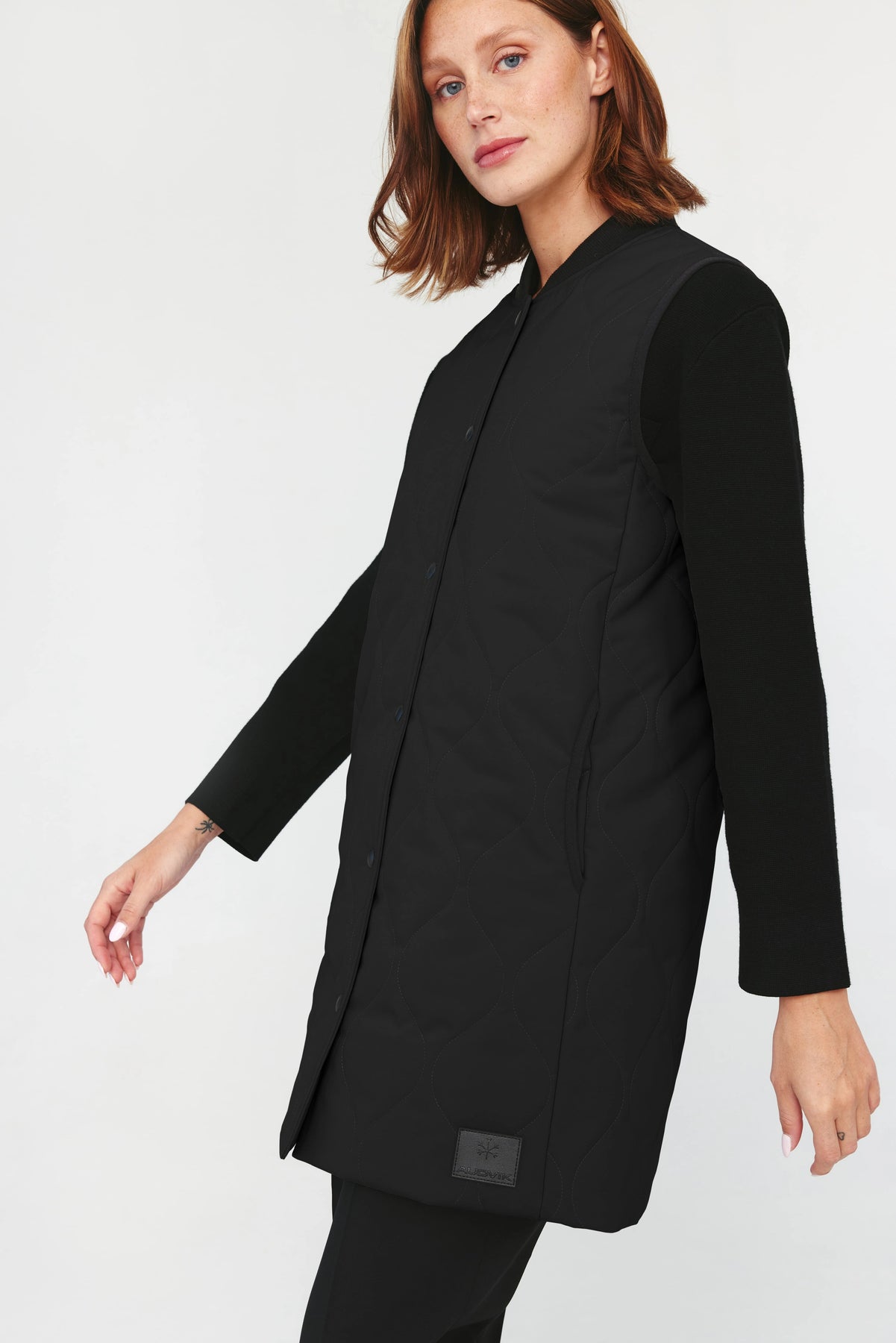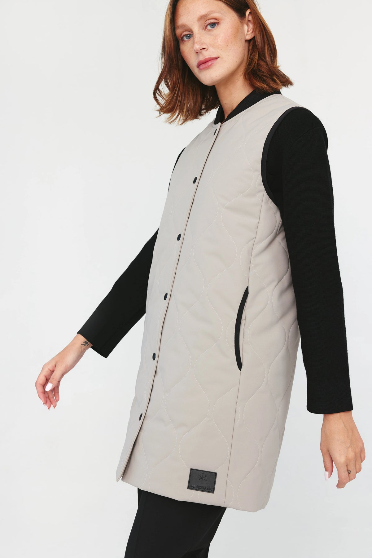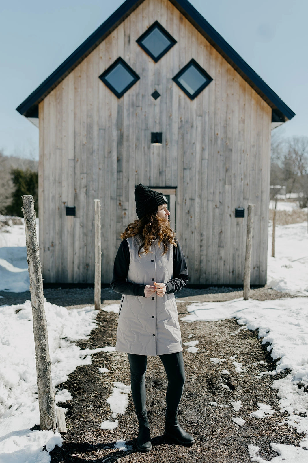 Préparez-vous pour les temps plus frais avec notre toute nouvelle veste sans manches matelassée en Primaloft.  On adore sa longueur mi-cuisse alliant parfaitement style, confort et fonctionnalité. Cette pièce essentielle, au design épuré et moderne, vous enveloppera de chaleur tout en offrant une liberté de mouvement idéale pour vos journées chargées.