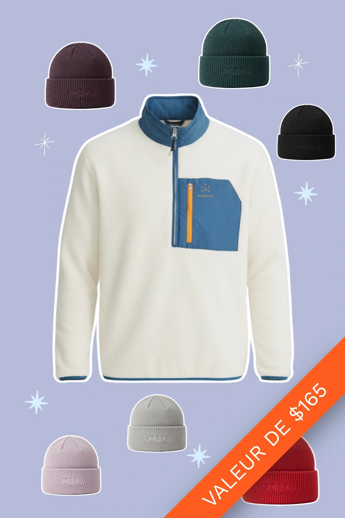 Découvrez le Kit Hivernal Spécial Fêtes par FOSFO, composé de notre Teddy 1/2 Zip et d’une tuque Aventure de la couleur de votre choix. C’est le cadeau parfait pour faire plaisir à un proche et lui offrir douceur et chaleur pour l’hiver ! 🎁