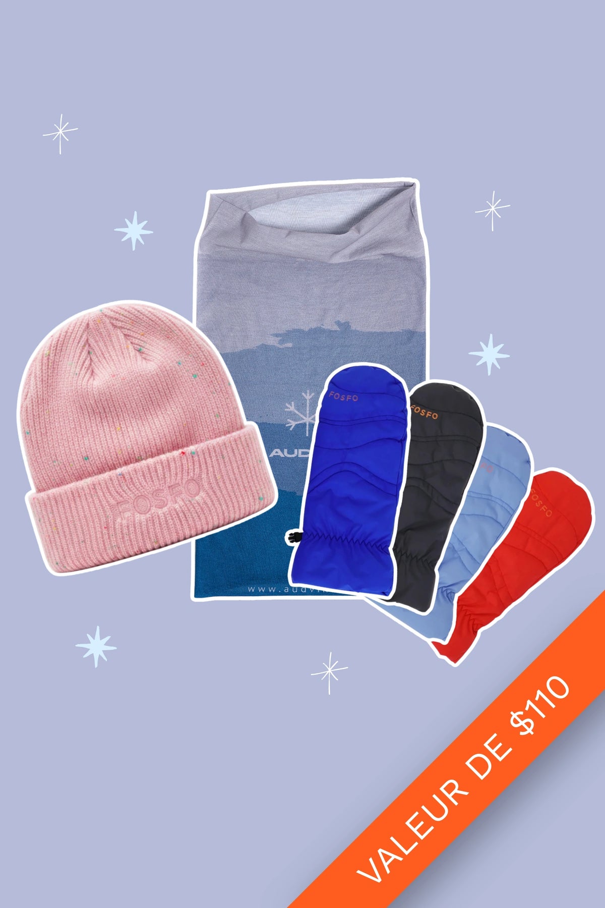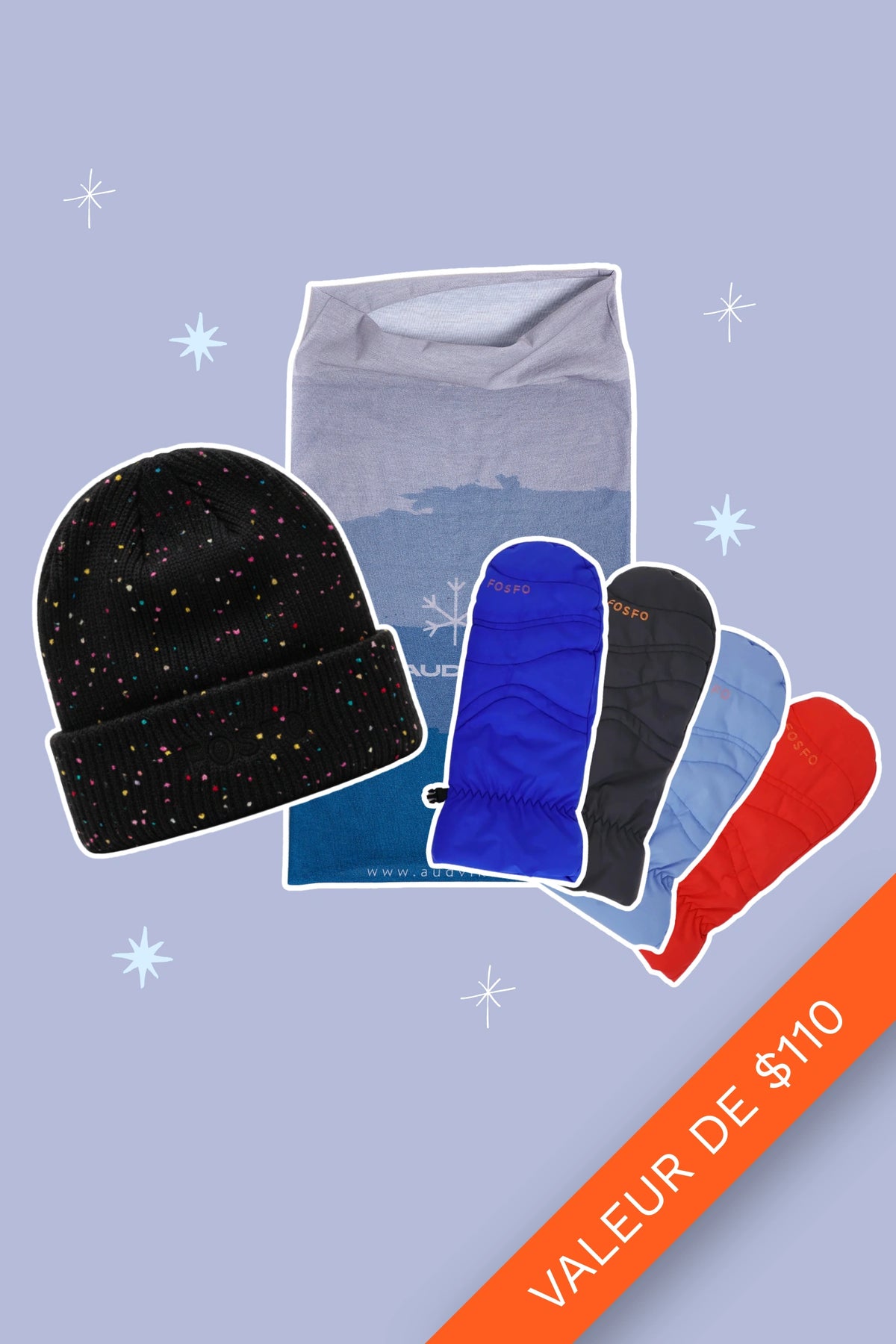 Découvrez le Kit Hivernal Confetti Spécial Fêtes par FOSFO, composé de notre Cache cou Bleu/Gris, d’une tuque Confetti et d'une paire de mitaines Freya de la couleur de votre choix. C’est le cadeau parfait pour faire plaisir à un proche et lui offrir douceur et chaleur pour l’hiver ! 🎁