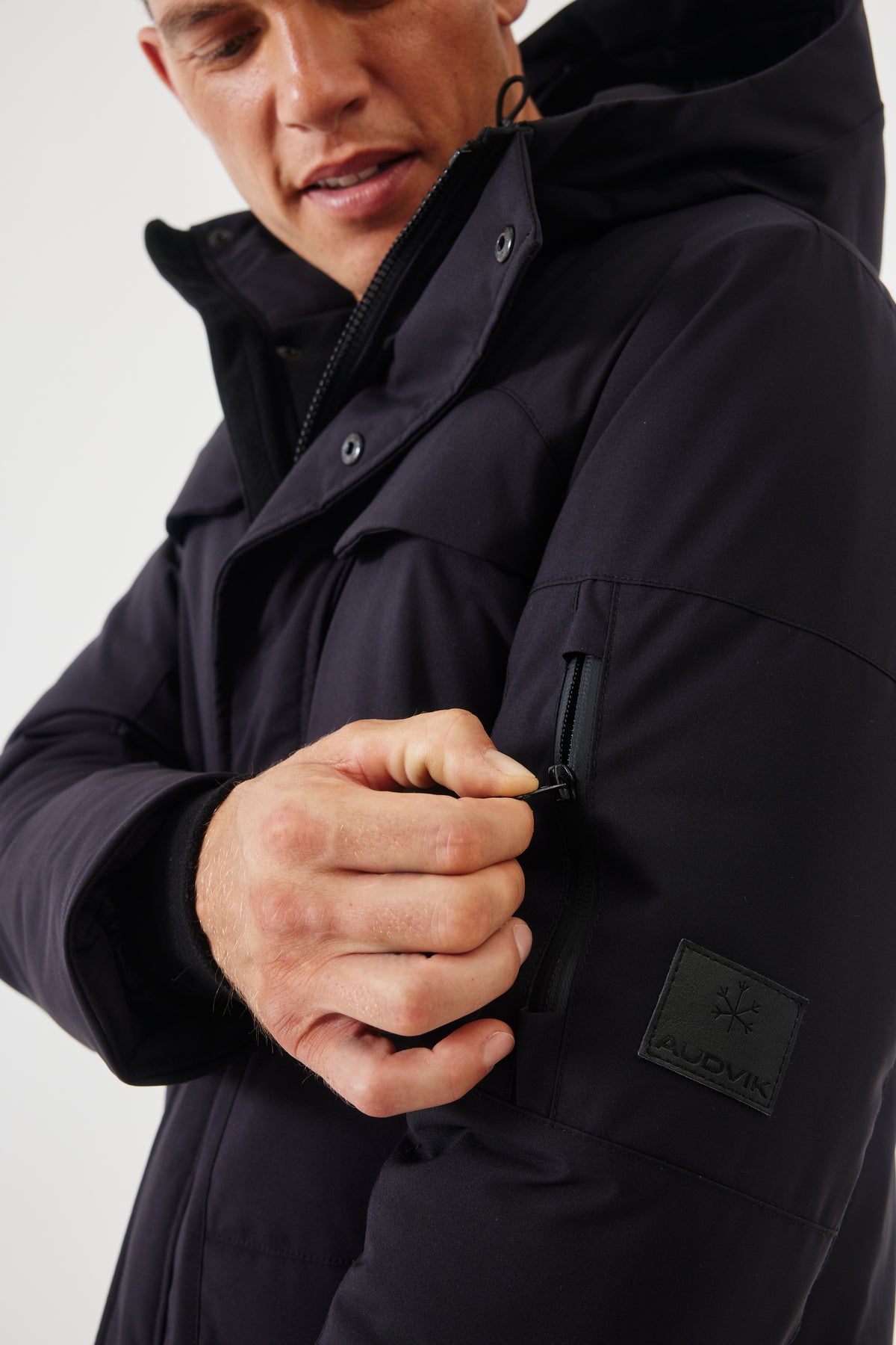 Vous apprécierez son aspect utilitaire, avec ses 5 poches extérieures qui ajoutent à la polyvalence : 4 poches extérieures pour garder vos mains au chaud, une poche au biceps sécurisée par une fermeture éclair imperméable, et une poche intérieure pour vos effets personnels.